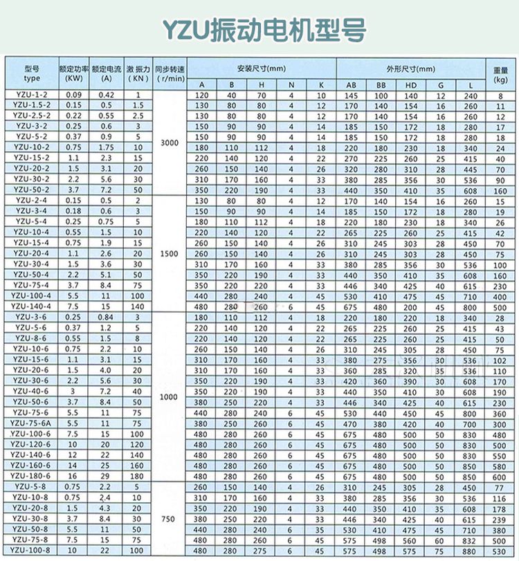由上表我們可以清晰地看到,YZUL振動電機有不同的規格型號,功率越大,價格就會越高。