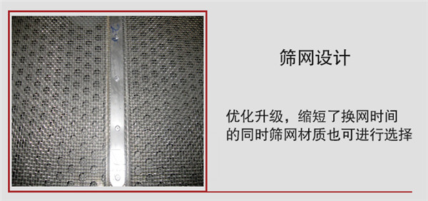 3,篩網(wǎng)設(shè)計進(jìn)行優(yōu)化升級,縮短了換網(wǎng)時間的同時篩網(wǎng)材質(zhì)也可進(jìn)行選擇。