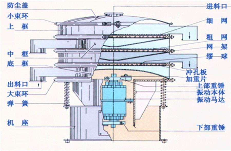 旋振篩是一種高精度細粉篩分機械,其噪音低、效率高,快速換網只需3-5分鐘,全封閉結構,適用于粒、粉、粘液等物料的篩分過濾。旋振篩是由直立式振動電機作激振源,電機上、下兩端安裝有偏心重錘,將電機的旋轉運動轉變為水平、垂直、傾斜的三次元運動,再把這個運動傳遞給篩面。調節電機上、下兩端的相位角,可以改變物料在篩面上的運動軌跡。