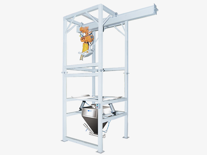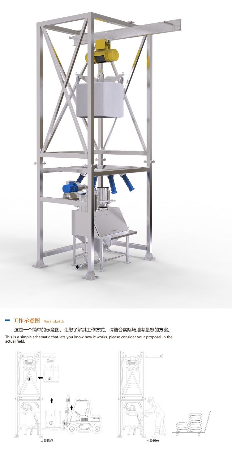 起重設(shè)備:自身攜的帶起重設(shè)備將大袋(噸袋)吊裝到卸料機(jī)的機(jī)架上,不需用外界的幫助。
