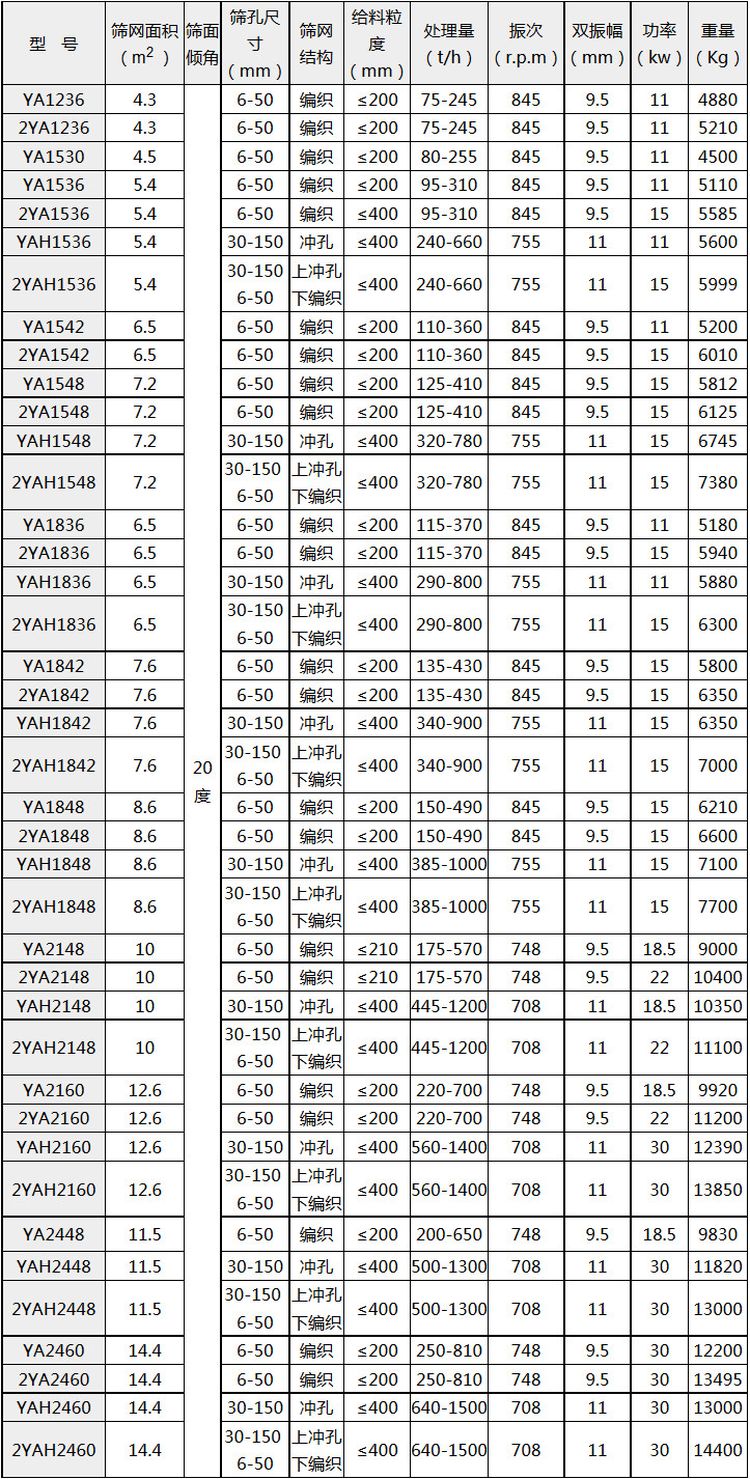 YA系列圓振動篩的主要技術參數: