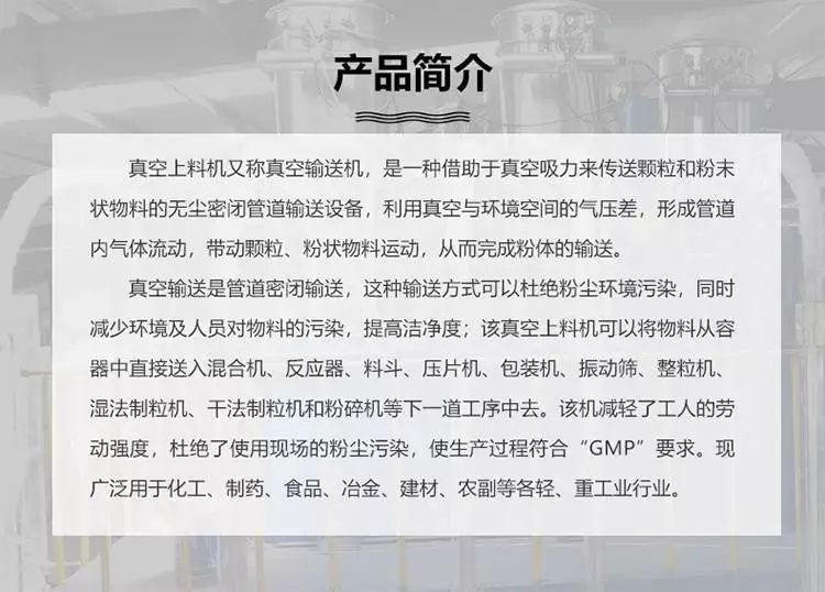 ZKS系列真空上料又稱真空輸送機(jī),是通過氣體產(chǎn)生真空輸送粉體料的設(shè)備,是氣體輸送的一種。適用于醫(yī)藥、食品、化工、冶金、建材等多個行業(yè),針對各種粉體物料的密閉輸送,提高物料的潔凈度,能滿足不同客戶的多種輸送需要。