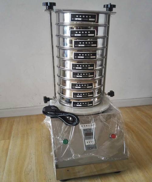 電機(jī)帶動(dòng)齒輪通過(guò)同步帶傳動(dòng)到主軸上,經(jīng)齒輪變速后主軸按要求的轉(zhuǎn)速轉(zhuǎn)動(dòng),主軸帶動(dòng)偏心輪使滑板做往復(fù)運(yùn)動(dòng),帶動(dòng)安裝在滑板托盤中的試驗(yàn)篩左右搖動(dòng),同時(shí)主軸帶動(dòng)頂桿齒輪轉(zhuǎn)動(dòng),變速后頂桿齒輪通過(guò)凸輪頂擊頂桿,頂桿使拍錘上下拍擊試驗(yàn)篩上蓋,使得試驗(yàn)篩、分樣篩中的物料往復(fù)和上下振動(dòng),使小于試驗(yàn)篩的篩面網(wǎng)孔的物料顆粒篩分進(jìn)下層試驗(yàn)篩,如此層層篩選,使每層試驗(yàn)篩內(nèi)只留相同粒度的物料。達(dá)到不同粒度的分離并確定此物料的粒度組成。